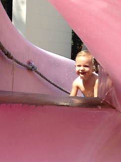| Mr. Irresistible climing the steps to the slide at the pool. I could just gobble him up! |